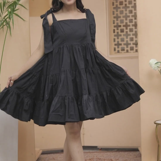 Turn heads with this chic black sleeveless dress, designed with tiered layers for a flared silhouette and playful shoulder tie-up straps for a feminine touch. Perfect for brunches, evening outings, or casual get-togethers, this flowy dress blends comfort with elegance.