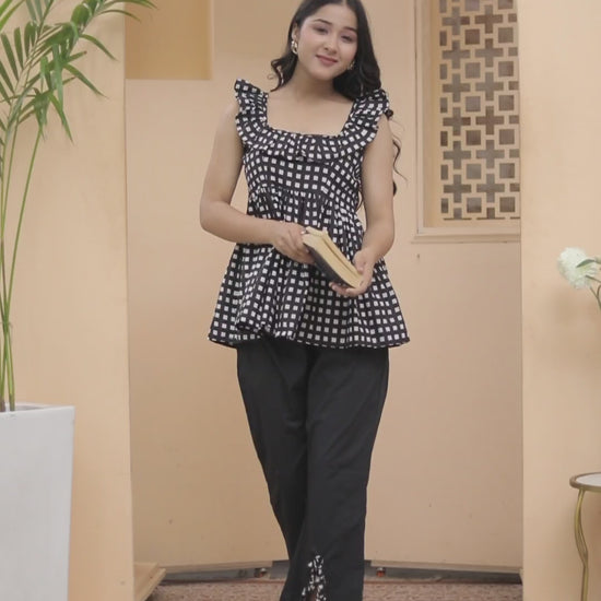 Stay chic and comfortable with this Black & White Checkered Co-ord Set, designed for a blend of elegance and ease. Featuring a ruffled square-neck top with a flared hem and straight-fit pants with subtle slit details, this set is a versatile choice for day-to-night styling. Whether you’re heading for brunch, work meetings, or casual evenings, this outfit ensures you stand out effortlessly.