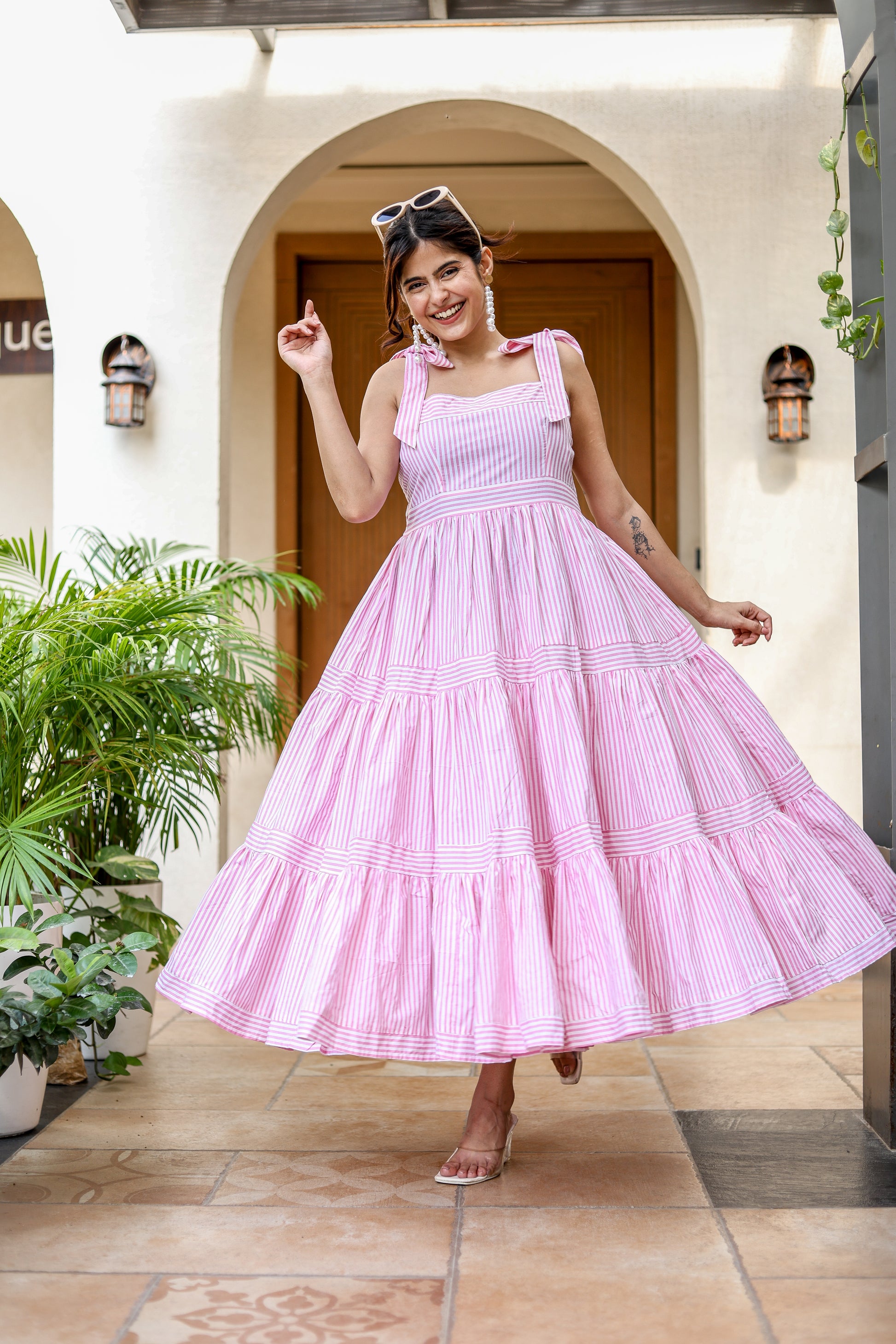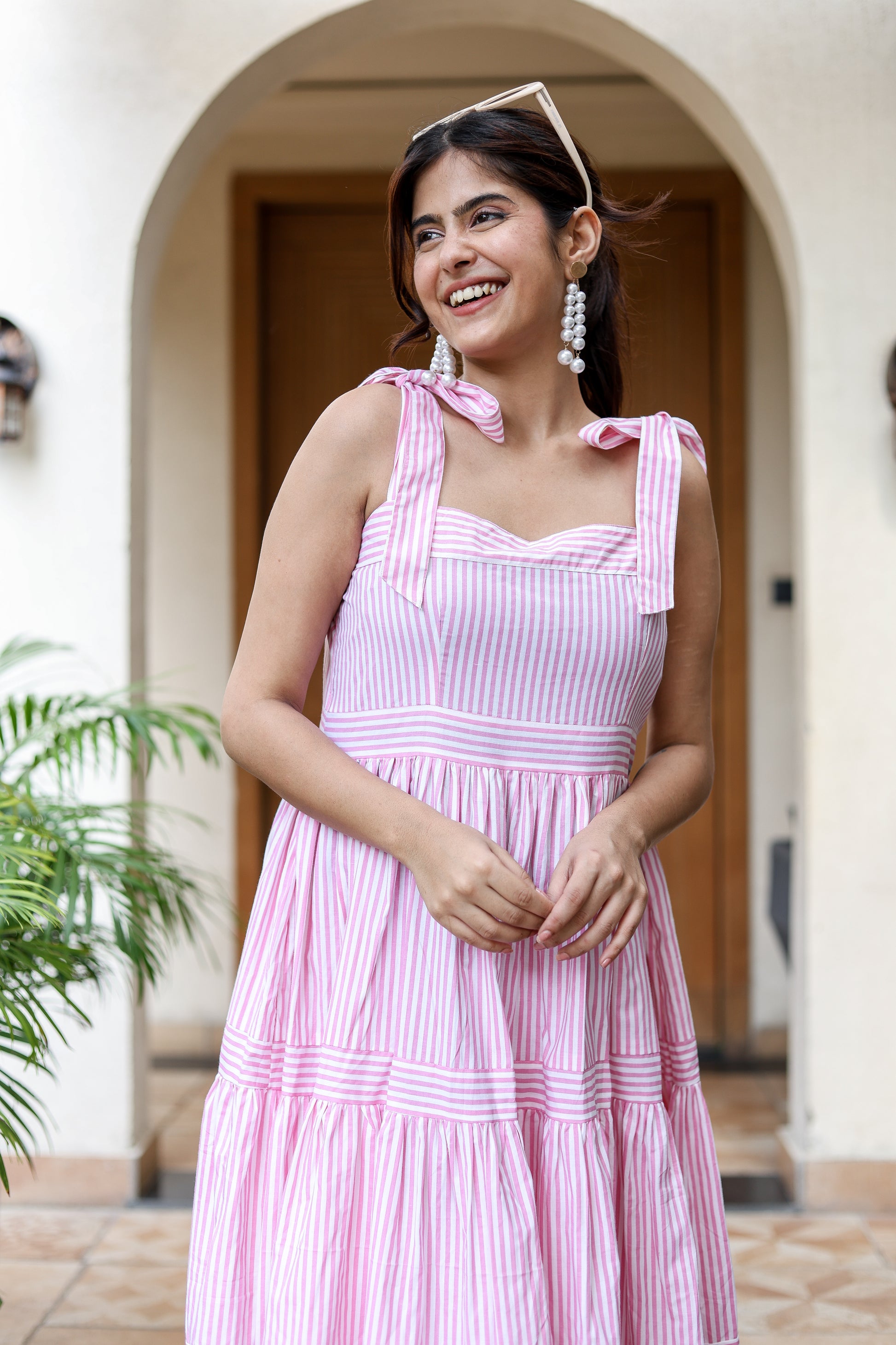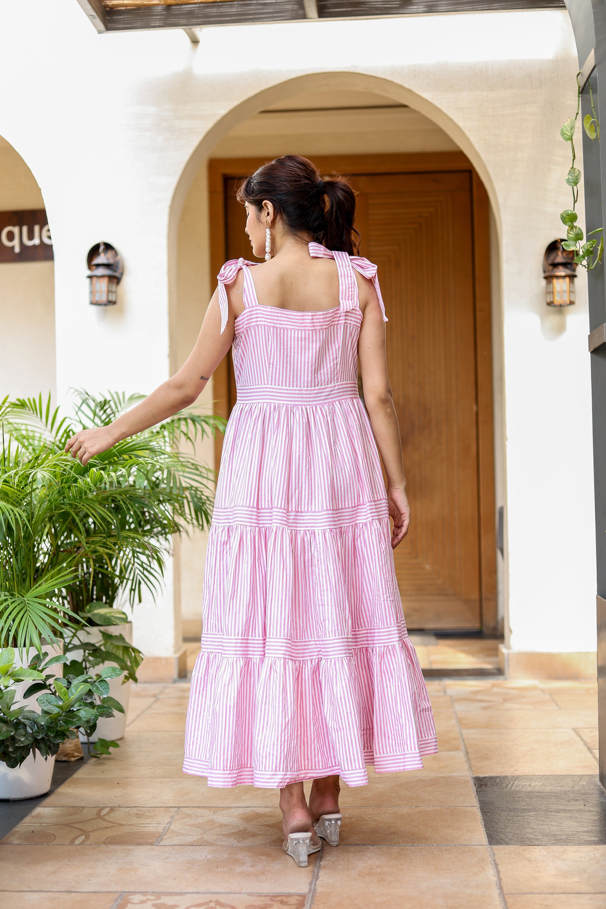 Step into effortless charm with this pink and white striped midi dress, designed with delicate bow tie shoulder straps and a flowing tiered silhouette. The playful stripes paired with a breezy fit make it perfect for casual brunches, vacations, or day outings, while keeping you stylishly comfortable.