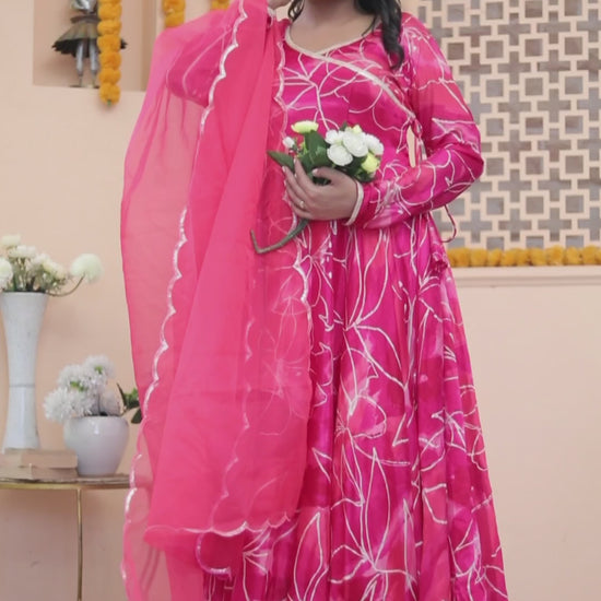 Step into festive elegance with this magenta handblock foil printed Anarkali set. Crafted with a flattering flowy silhouette and detailed with gold foil floral prints, it’s designed to make you shine at weddings, celebrations, and special gatherings. The set comes with a matching sheer dupatta with scalloped edges, adding grace to your every twirl. The deep back tie-up detail enhances its traditional charm while ensuring a comfortable fit.