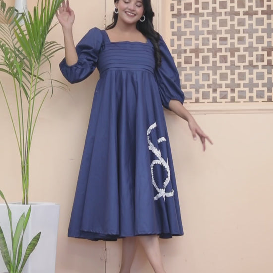 Turn heads with this navy blue embroidered midi dress, crafted for elegance and effortless style. Featuring a statement oversized floral embroidery, this dress blends traditional charm with modern sophistication. Its square neckline and pintuck bodice add a tailored touch, while the flowy A-line silhouette ensures comfort and grace. Perfect for festive gatherings, evening outings, or special occasions.