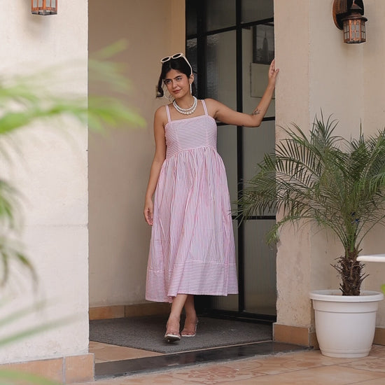 Brighten your wardrobe with our Pink Striped Midi Dress, the perfect blend of fresh charm and playful elegance. Designed with a classic square neckline, delicate spaghetti straps, and a breezy A-line silhouette, this dress is all about effortless style. The soft pink and white stripes give it a youthful, chic vibe — perfect for casual days, brunches, or weekend getaways.