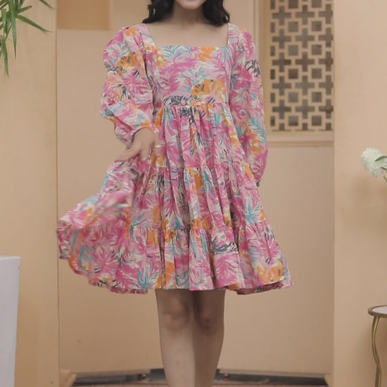 Bring summer vibes to your wardrobe with this tropical pink floral dress, designed with a flattering square neckline and flowy tiered silhouette. The vibrant mix of pink, orange, teal, and grey floral prints makes it a standout piece for brunches, vacations, and festive outings. The long puff sleeves add elegance while keeping it playful and chic.